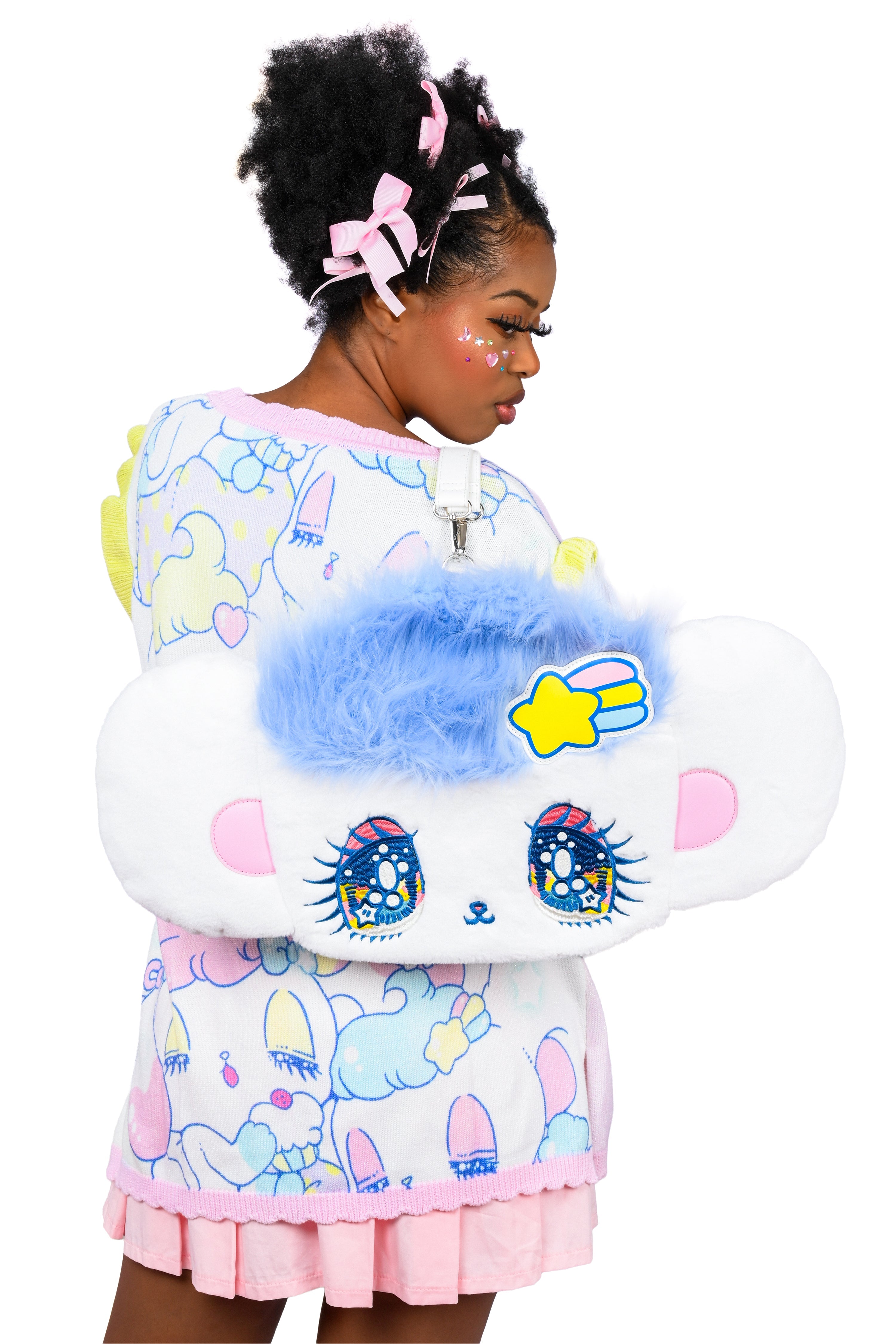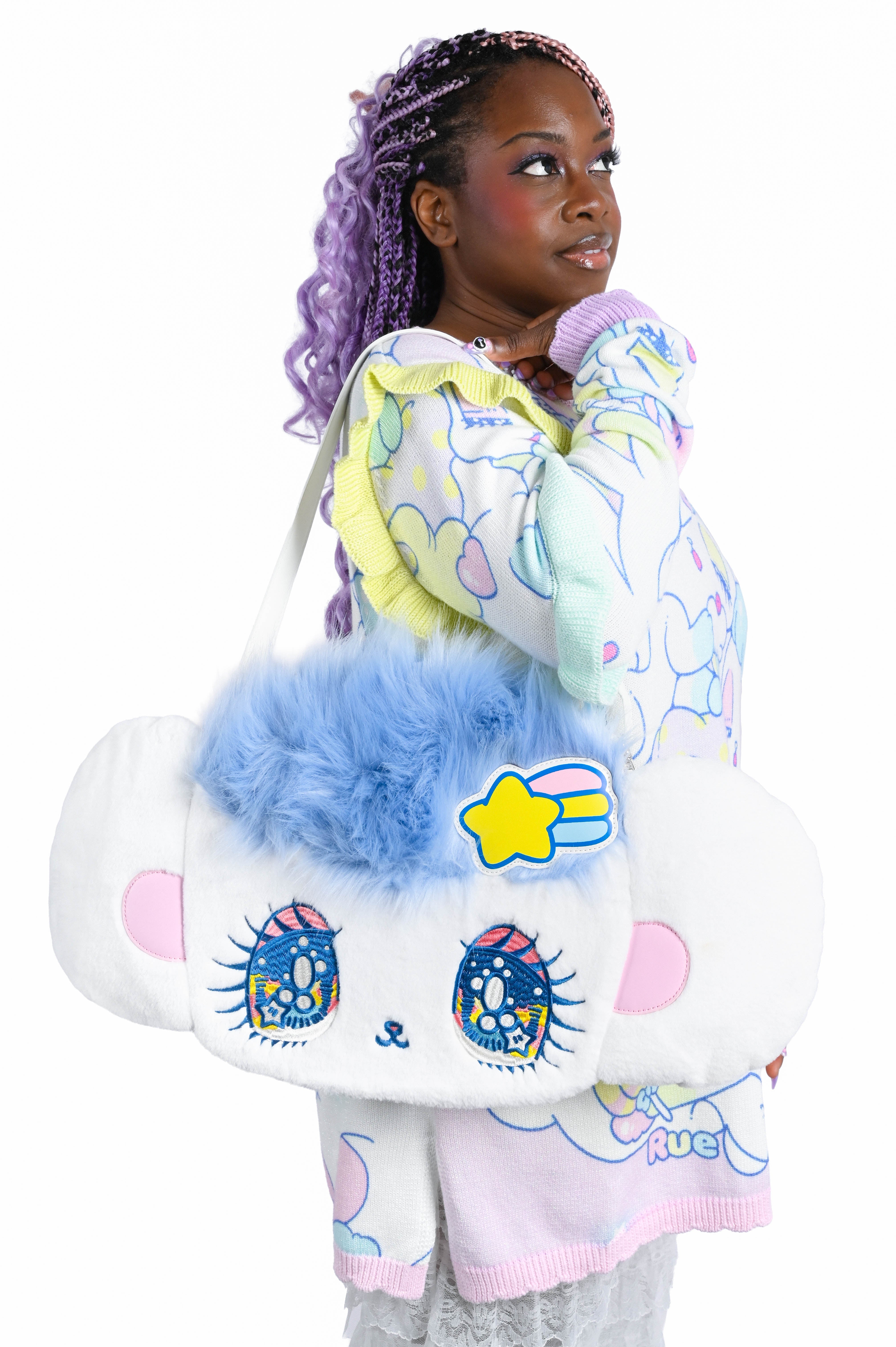 The crown jewel of our PeroPero Sparkles collection is this extra large Melo convertible 2 way bag. Featuring Melo's signature giant ears and huge sparkling eyes that are beautifully embroidered on. Make sure to toussle her hair when you receive her to make sure she looks her best!